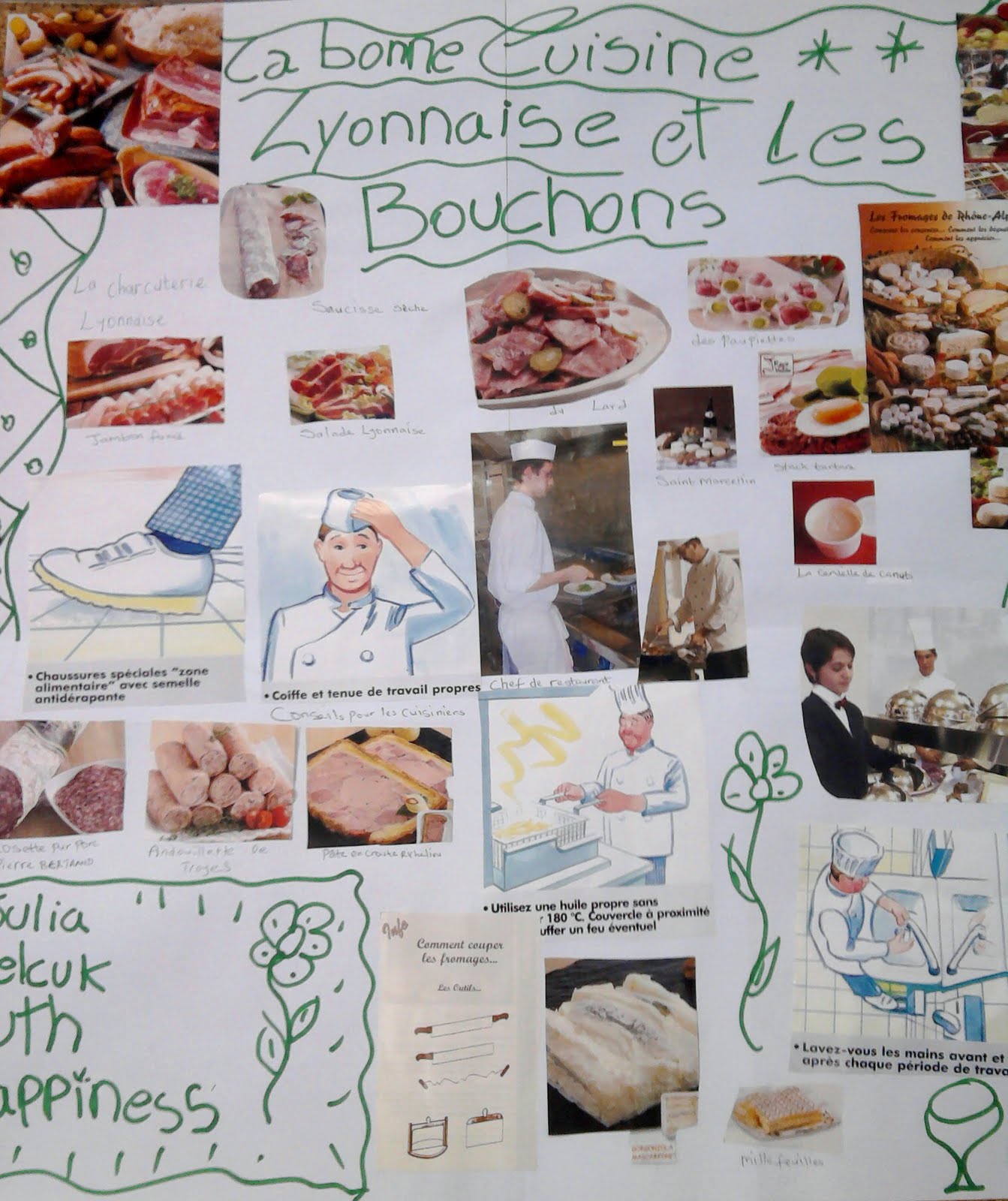 Il y a quelques semaines, nous avons travaillé sur la ville de Lyon. Nous avons regardé un film et ensuite nous avons réalisé des affiches sur les musées de Lyon ( Khadija, Ashkab, Salomon et Liana), sur la fête des Lumières (Abakar, Anna, Marleen et Al Faida) et la gastronomie lyonnaise et les bouchons (Julia, Selcuk, Ruth, Happiness).